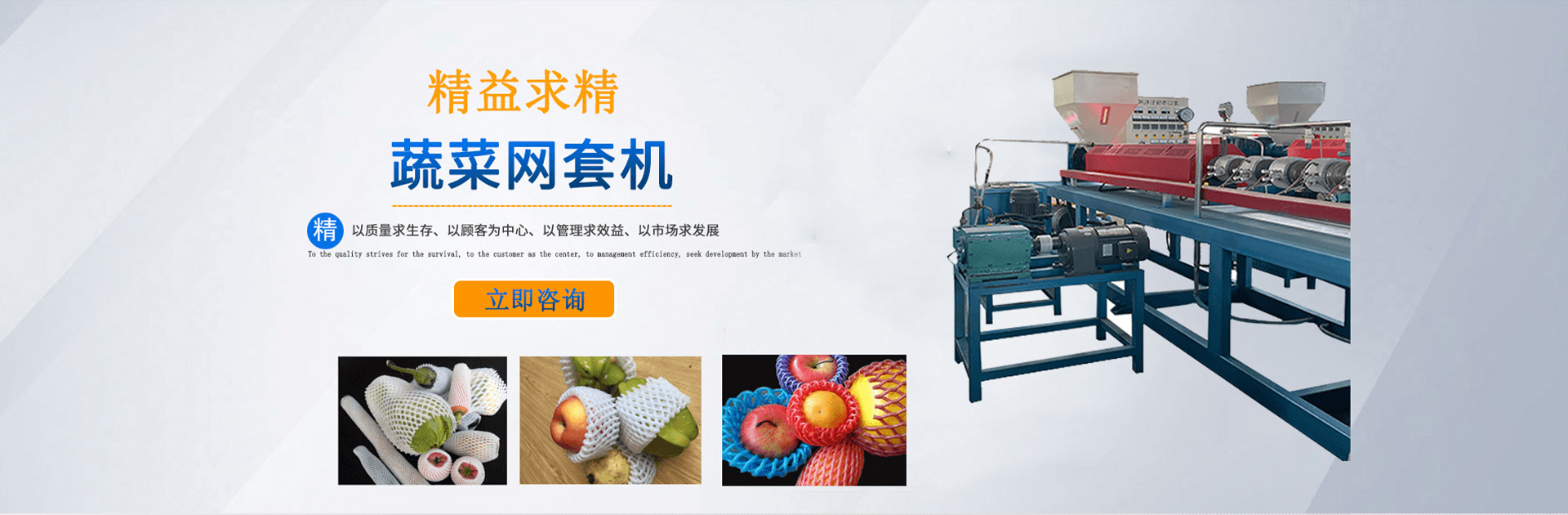 本公司創建于2002年,是一家集研發、加工、制作為一體,專門制作水果、蔬菜、玻璃器皿等發泡軟包裝設備的生產廠家。公司擁有眾多專業骨干人員,技術力量雄厚,可提供全套的售前及售后一條龍全方位服務。公司主營EPE發泡網套機、EPE發泡棒自動化設備。是深受業界好評的網套機生產廠家,我廠生產的網套機價格合理,歡迎新老客戶前臺詢價!